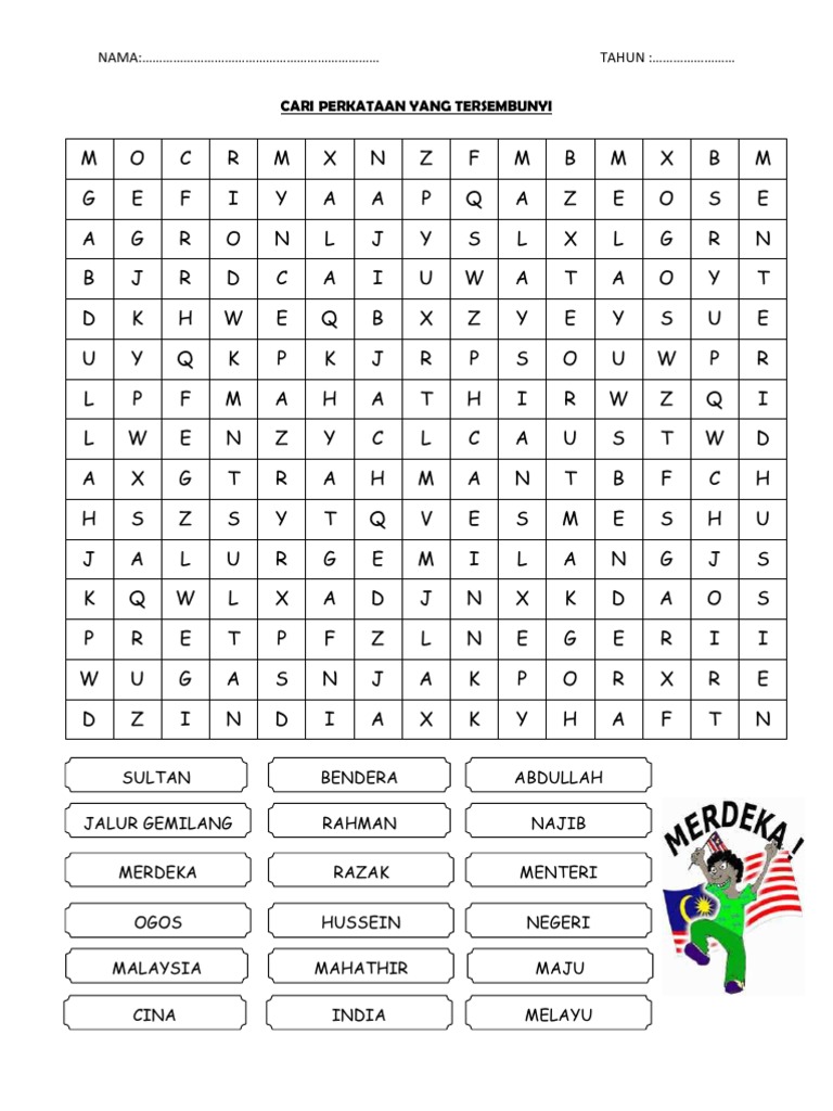 Tahun :… cari perkataan yang tersembunyi mahathir jalur gemilang merdeka ogos malaysia benderasultan abdullah razak najib hussein rahman menteri negeri maju indiacina melayu m o c r m x n z f m b m x b m g e f i.