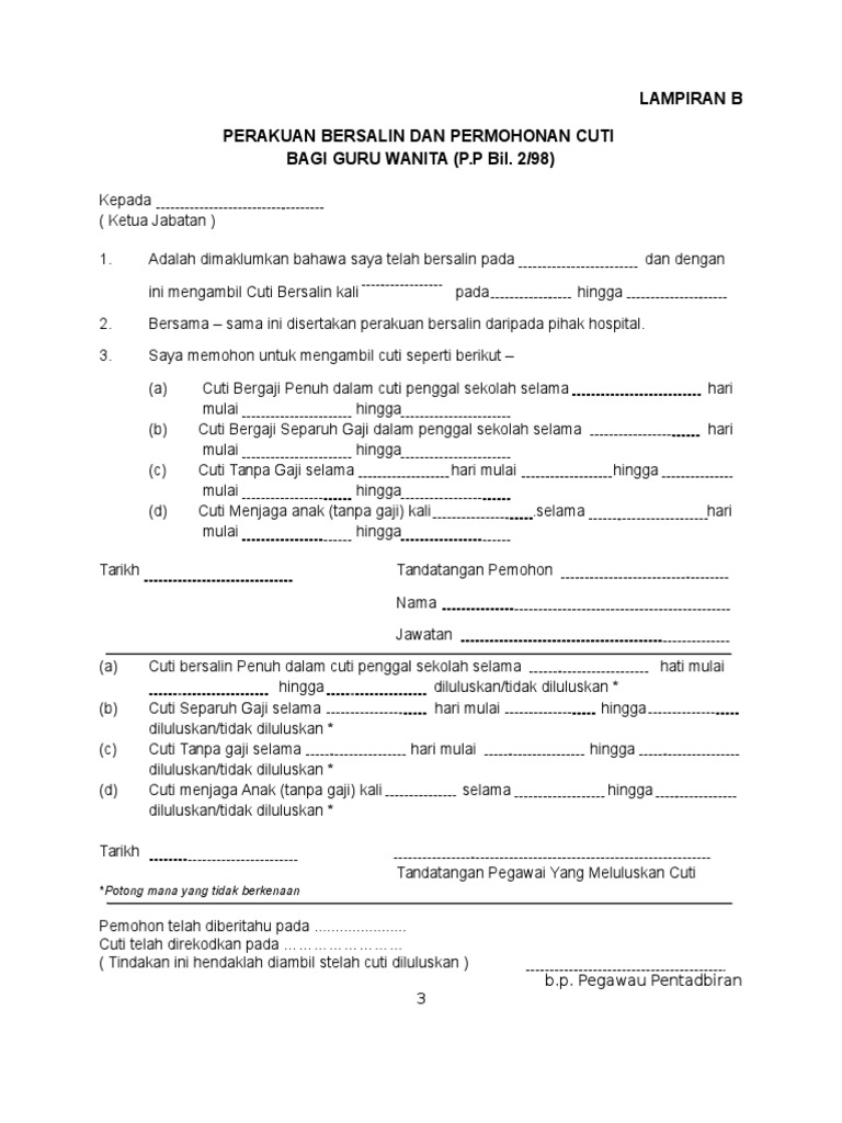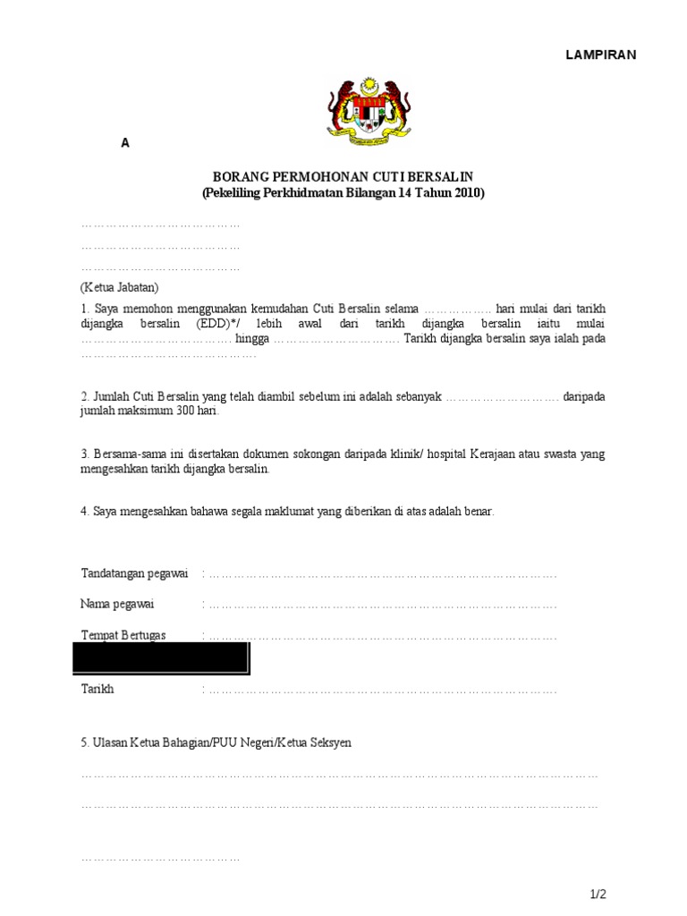 Lampiran A Cuti Bersalin - (tolak)kelayakan kemudahan cuti bersalin yang telah digunakan.. (tolak)kelayakan kemudahan cuti bersalin yang telah digunakan. Lampiran a borang permohonan cuti bersalin (pekeliling perkhidmatan bilangan 14 tahun. All formats available for pc, mac, ebook readers and other mobile devices. Selepas kerajaan malaysia berikan hak kepada golongan wanita bekerja sebagai penjawat awam di malaysia, akhirnya sekarang ini tiba giliran untuk anda. Berikut beberapa maklumat yang anda perlu tahu tentang maternity leave dan faedah bersalin (maternity allowance).