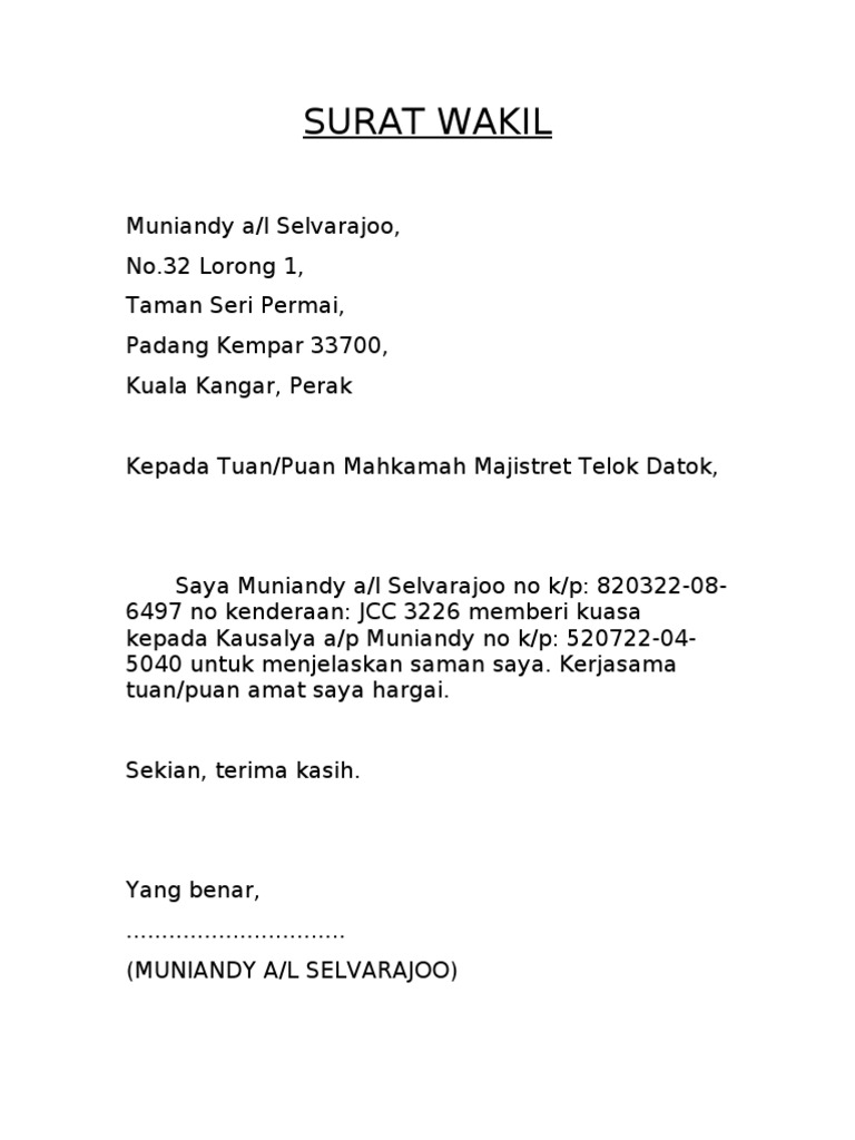 Contoh Surat Kuasa Wakil Syarikat from cdn.vdokumen.net Surat kuasa ialah surat yang berisikan wewenang atau pemberian kuasa kepada seseorang yang telah dipercaya, agar orang tersebut dapat bertindak sebagai wakil dari pemberi kuasa. Contoh surat kuasa pengambilan dokumen. Pahami persyaratan membuat surat kuasa berdasarkan contoh surat kuasa di bawah ini. Jadi dalam surat tersebut wajib disebutkan secara rinci misalnya mengajukaan gugatan, mengajukan alat bukti, dan lain sebagainya. Contoh surat kuasa pengambilan bpkb 11. Ada banyak contoh surat kuasa yang bisa menjadi referensi. Surat kuasa individu atau juga pribadi adalah surat keterangan yang membuat orang memiliki hak sesuai yang disebutkan pada surat itu. Documents similar to contoh surat kuasa tanah.